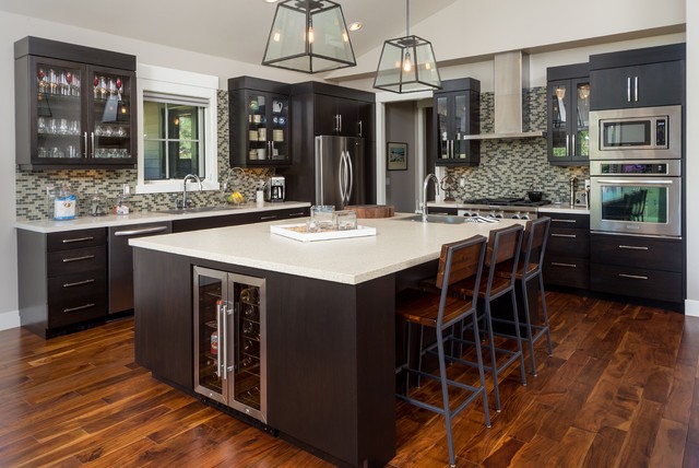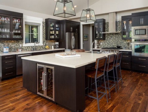 Kitchen islands continue to trend. Islands provide a central work station and storage, a place to eat meals, and a gathering area for entertaining. Having a flat, extended countertop without a raised bar will continue to be popular, for it provides a wider, unencumbered workspace.