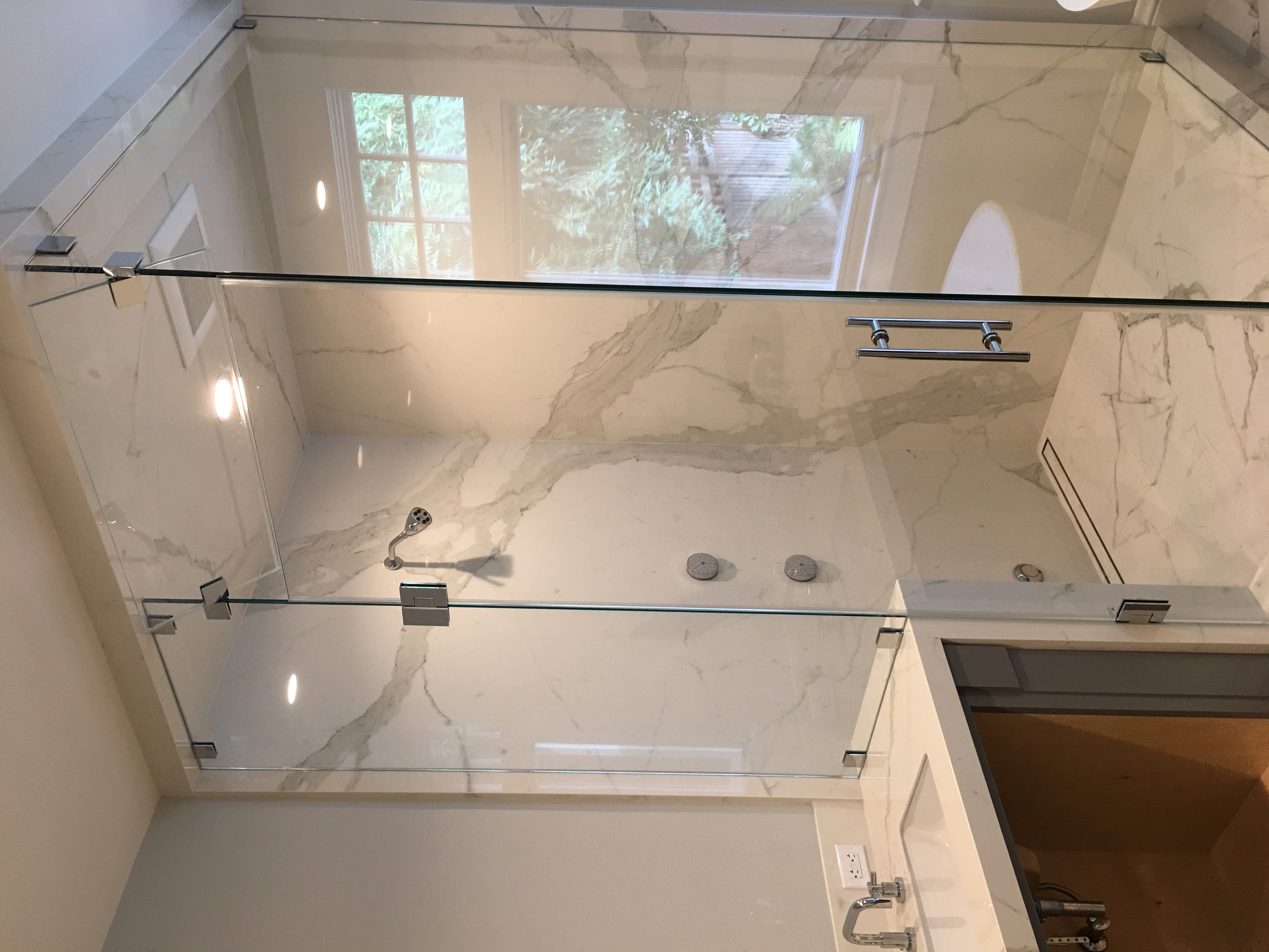Since the mid-1980's, there has been an explosion in the usage of different types of glass in shower doors and enclosures. Prior to this, the options to a client generally revolved around deciding between clear glass or obscure glass. Presently, there is a new "type" of clear glass available called "starphire" or "opti-white". This glass has had the majority of its iron removed, contributing to an almost perfectly clear tint or hue to the glass. There is nearly none of the "green" associated with regular clear glass. This "starphire" glass is an extremely useful application in bathrooms where clients want the "true" look of their tile and or marble. The "starphire" glass doesn't distort the look of the tile because it doesn't have the "greenish" tint commonly associated with clear glass.