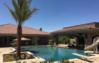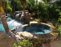 major trend in swimming pools right now is the freeform pool design surrounded by pavers or a custom concrete patio. Add a group of chaise lounges or an umbrella patio set, and you’ve set the scene for relaxation. When it comes to pool construction, people are embracing more of the freeform oasis kind of look versus the old style, which is the rectangle or L-shaped pool.