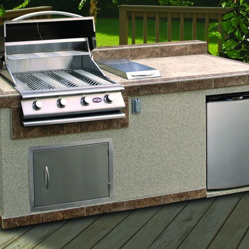 The LBK Outdoor Kitchen Islands are spacious islands with plenty of space for entertaining and creating delicious meals. The cooking station includes a multiple burner grill, stainless steel refrigerator, side burner, outdoor electrical, and access doors. You can choose the finish to compliment your backyard décor. They come in varies finishes, assorted colors and textures. Countertop options include granite or tile made out of porcelain or natural stone.