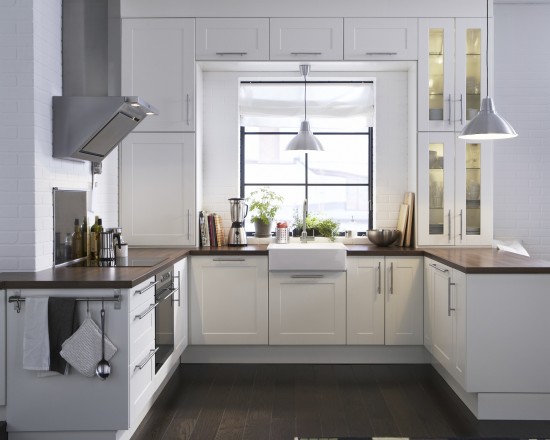 5.    Add light.  Lighting is an incredibly effective method for making space appear larger than it is.  Consider placing one large lamp or a series of smaller lamps on the wall that will flood the kitchen with light.  Additionally, under-cabinet lights do a great job of lighting up niches.  If you have a window in your kitchen, make sure you are not blocking light from coming in (perhaps you have the wrong curtain hanging).  Finally, if you can expand your window to let more light in, you should definitely explore this option.