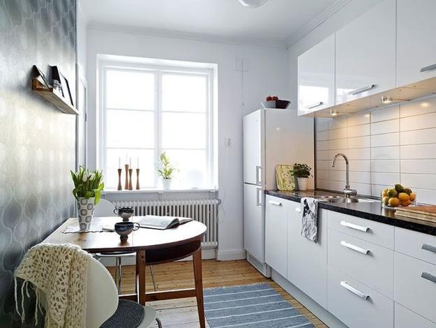 Paint your kitchen white as the color reflects light and gives the kitchen a spacious feel. Also, by painting your kitchen walls, cabinets, countertops and ceiling in white, you tend to form a seamless space. The white background also opens several options while choosing complementary colors. For instance, you can go completely subtle by picking pastel shades for your furniture and wall décor or give your small kitchen a contemporary look by picking bright, contrasting shades like orange and yellow.