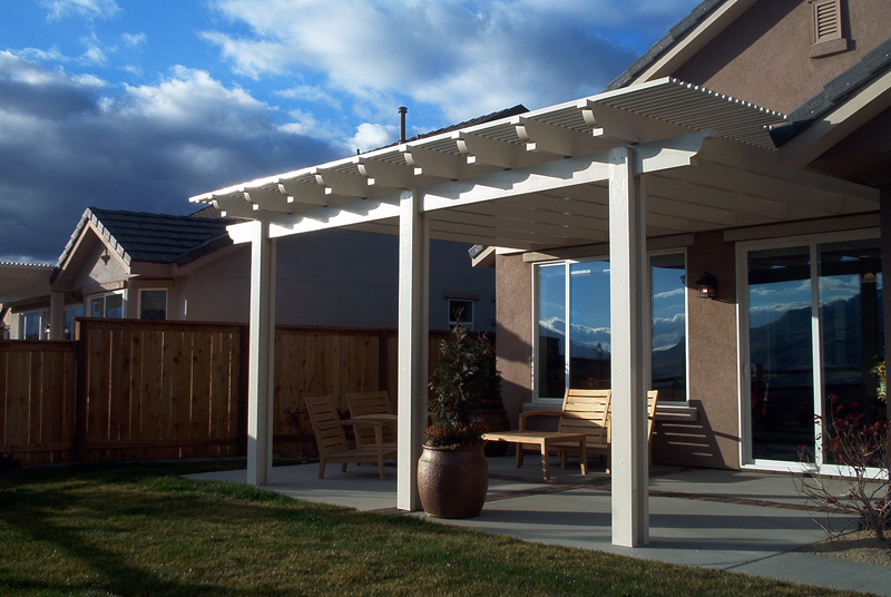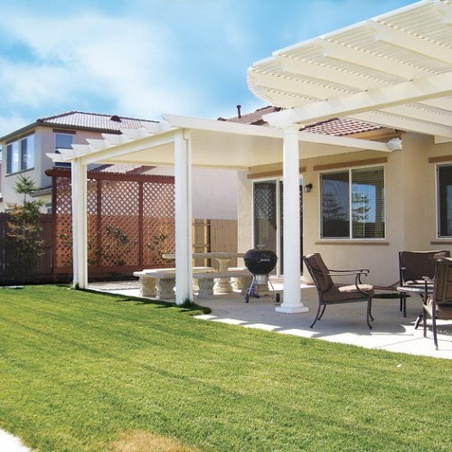 The best aluminum for all our patio covers and lattice shade structures is Alumawood. It is imprinted with wood-like texture and painted with baked on enamel finish. An Alumwood patio cover require no maintenance and you won’t have to repaint each year. It easily adapt to any existing structure. The aluminum is painted at the factory to match the colors of your house. The heavy guaged aluminum is 100% UV resistant and with the passage of time, it will not decolorize. Alumawood shade structures are strong, durable and maintenance free.